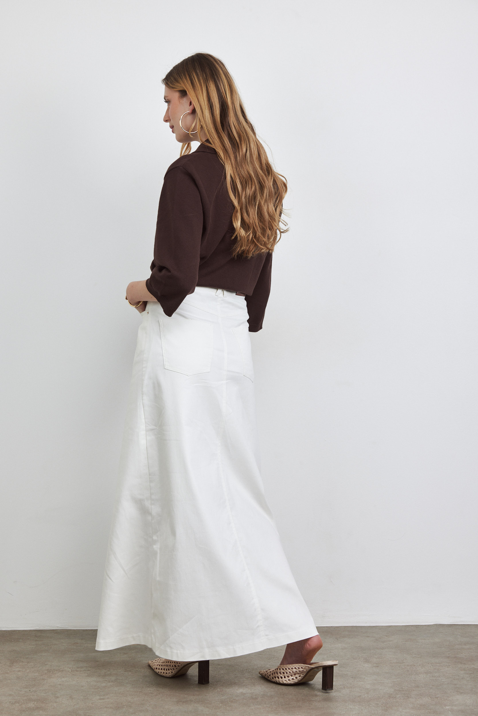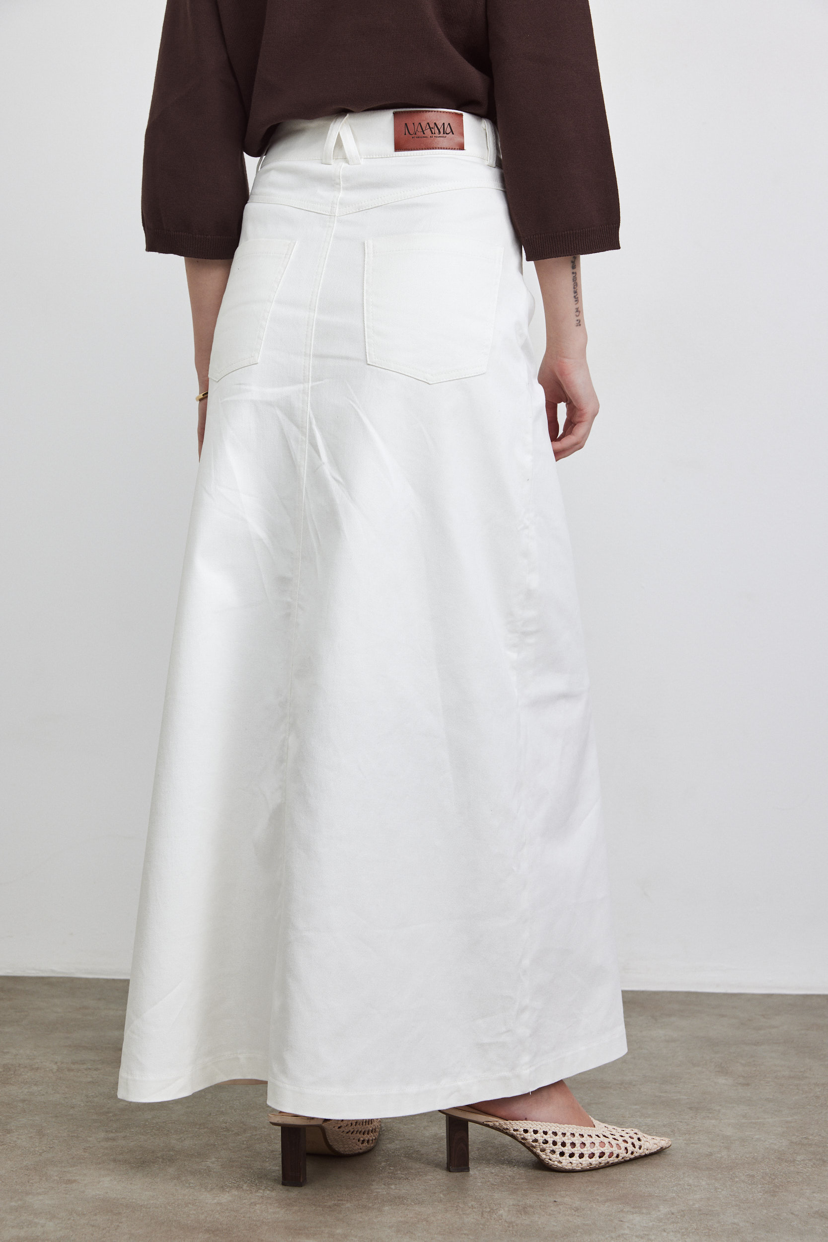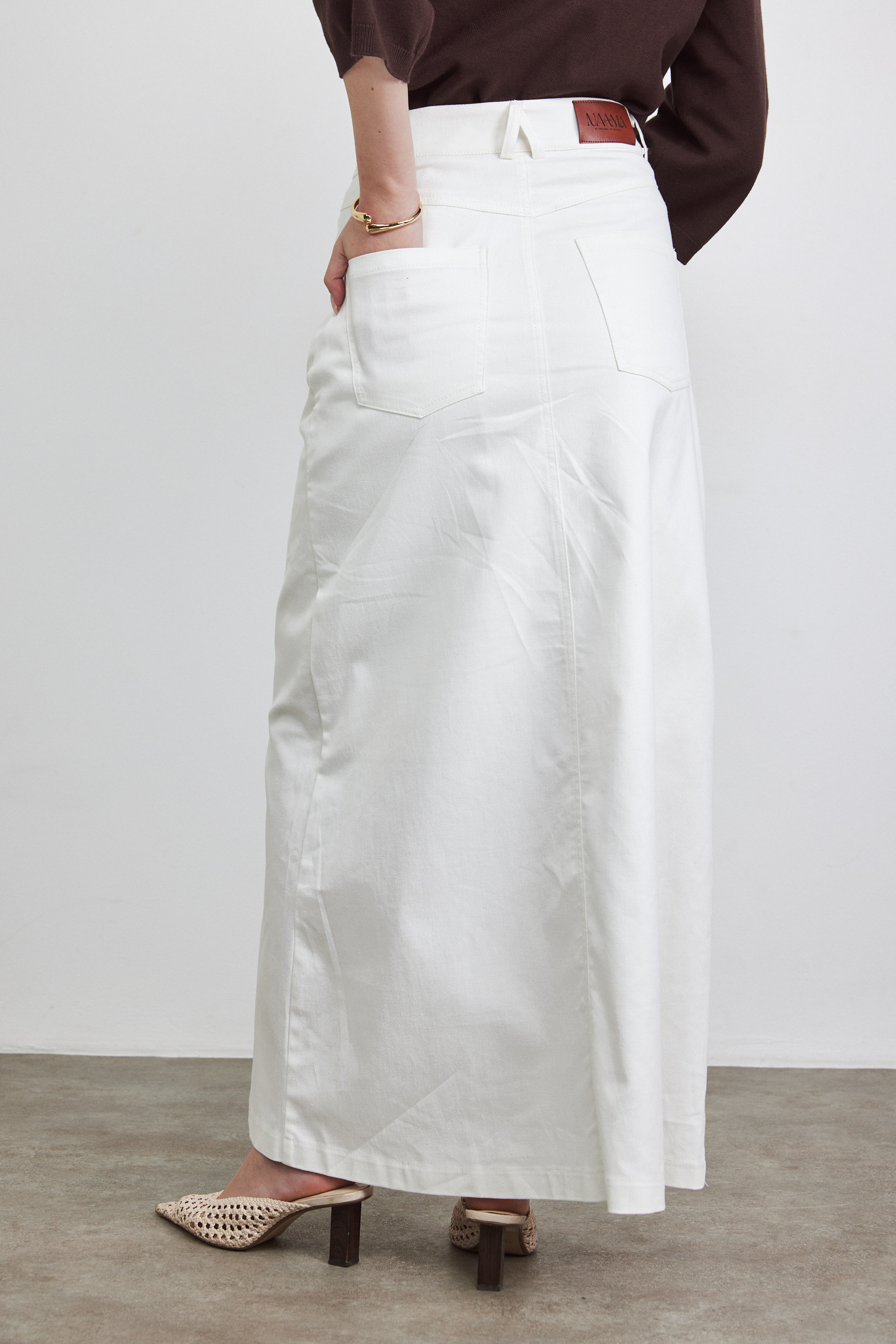 חצאית מקסי עם מראה ג’ינסי, בגיזרת A עדין ללא שסע.