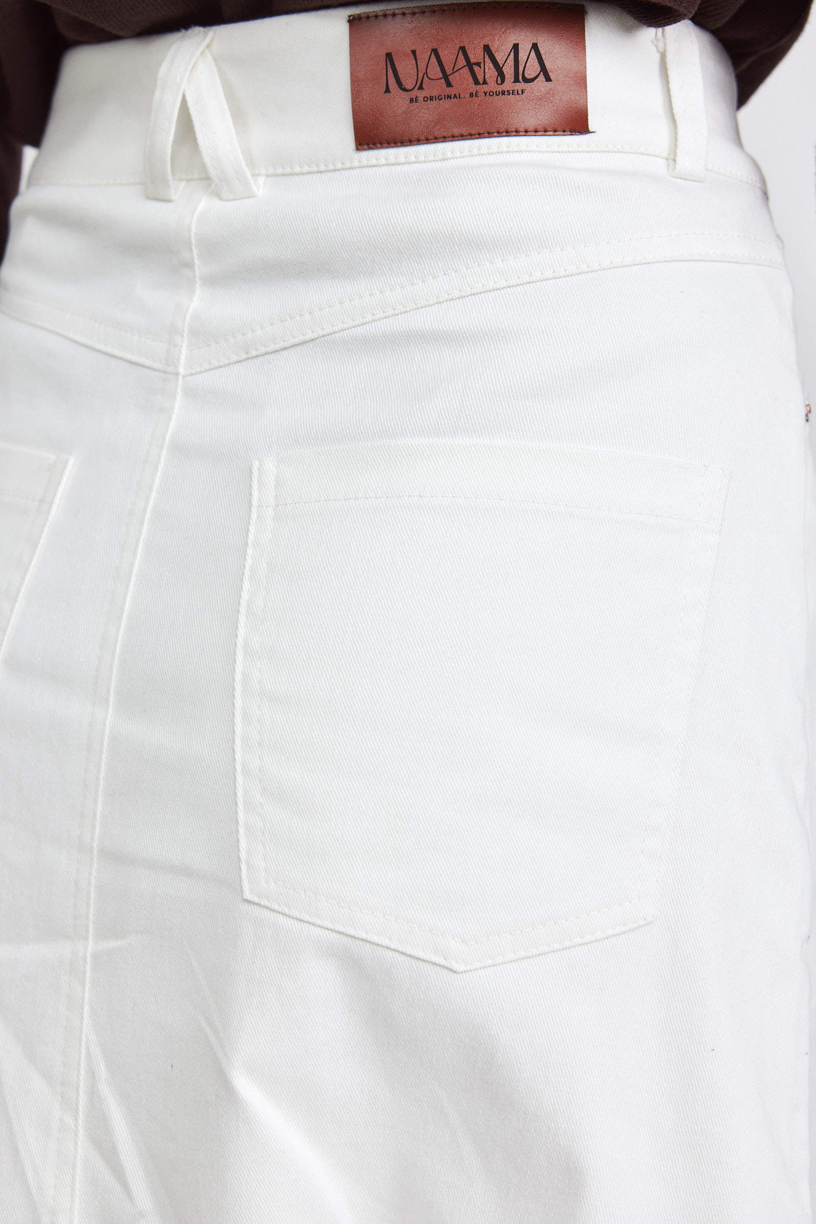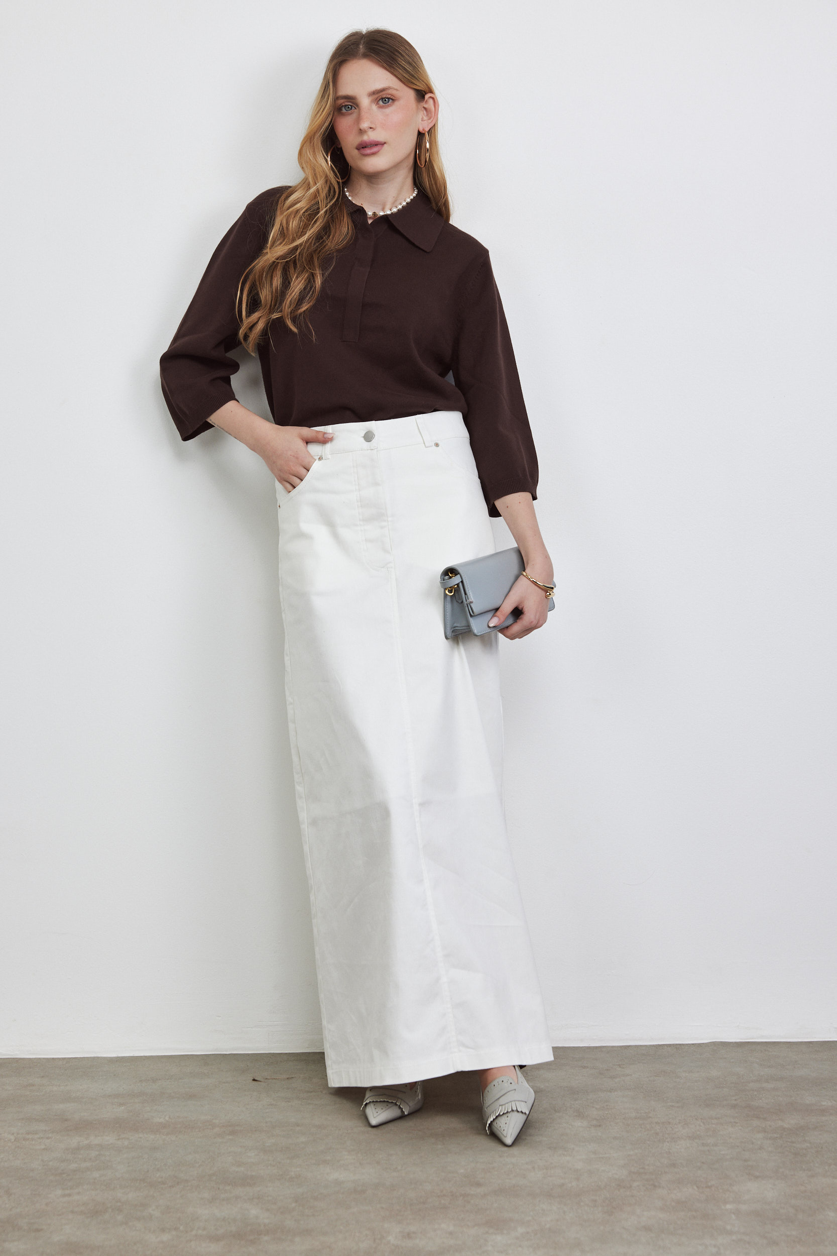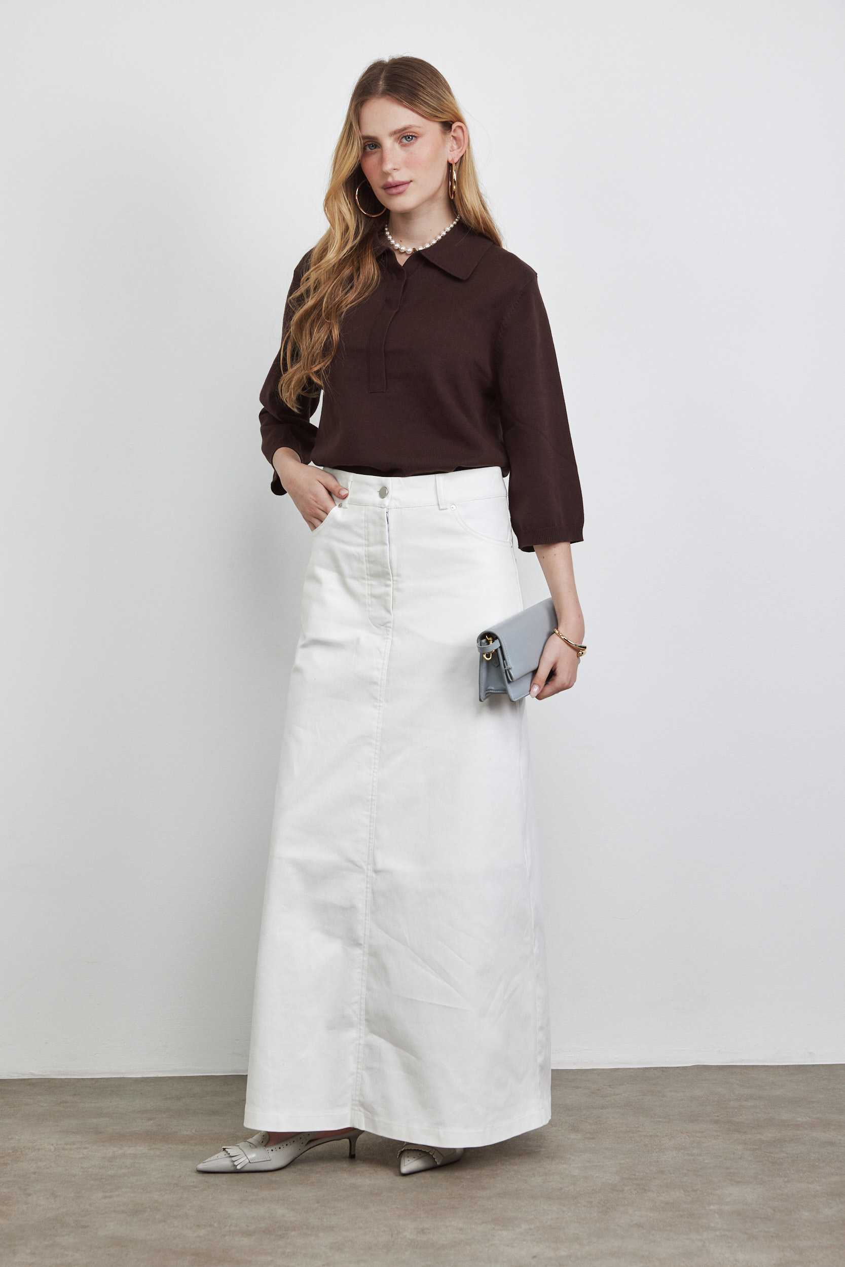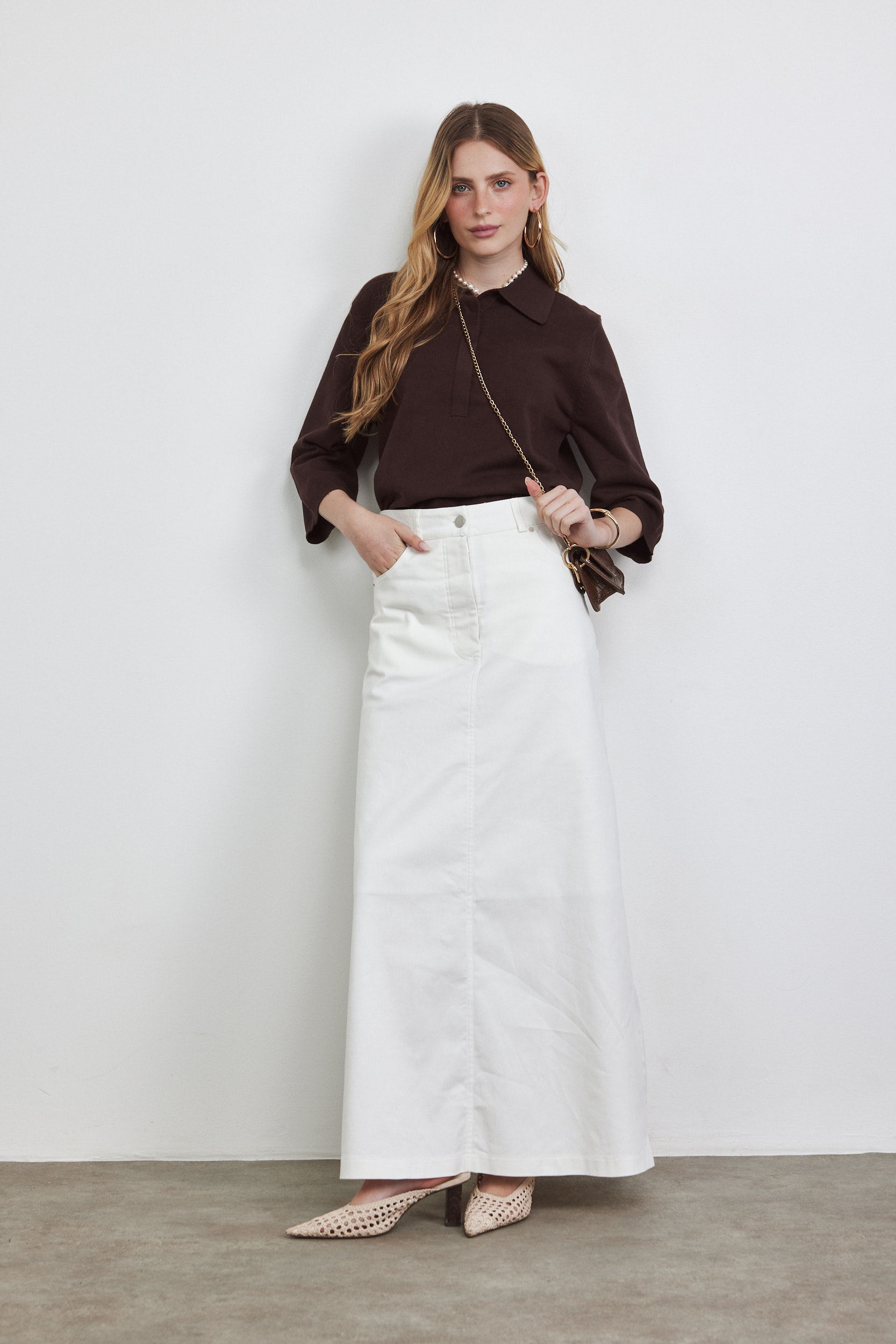 חצאית מקסי עם מראה ג’ינסי, בגיזרת A עדין ללא שסע.