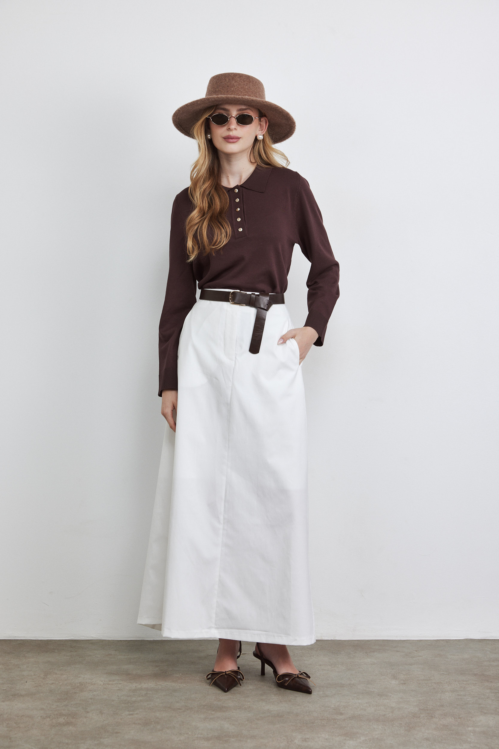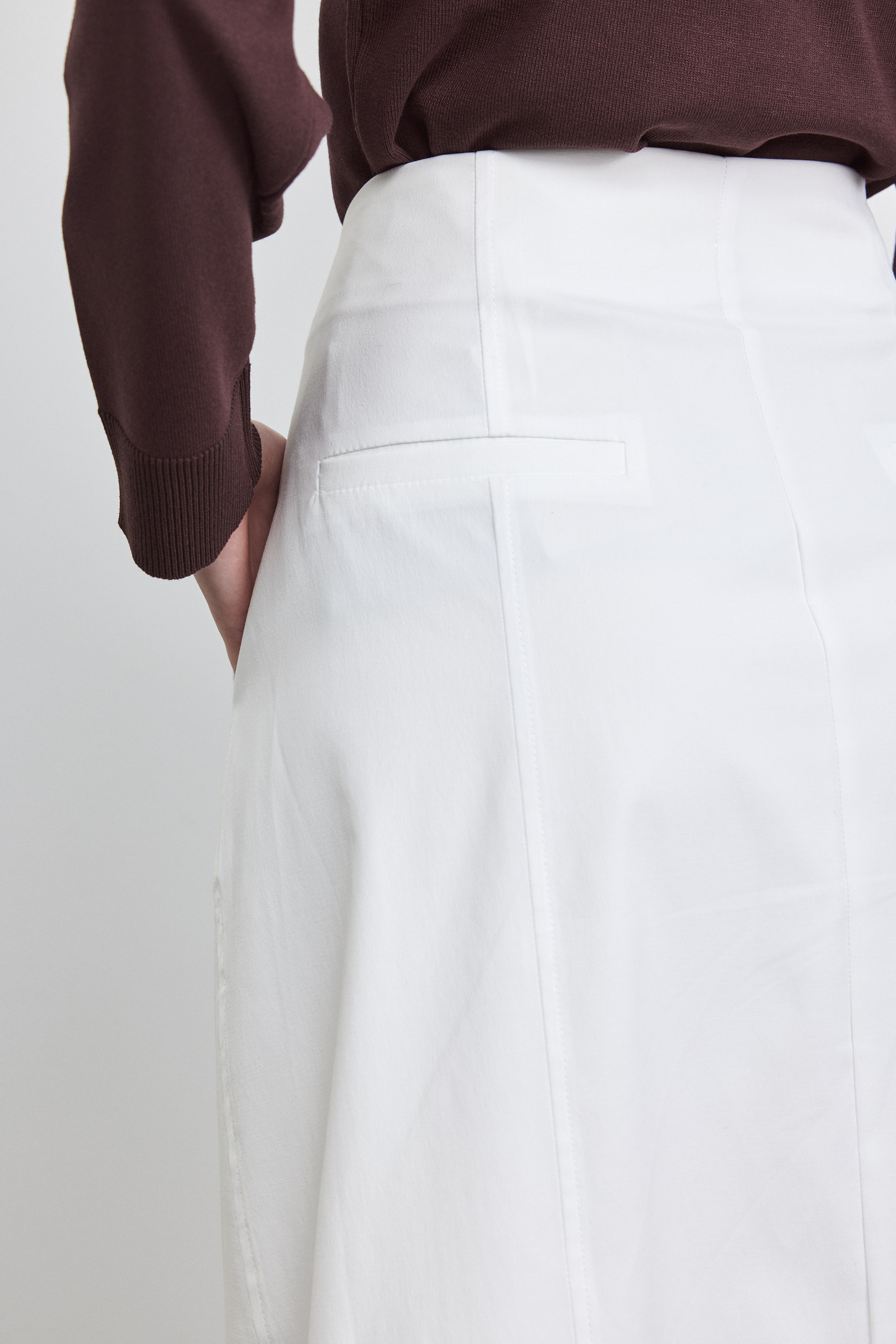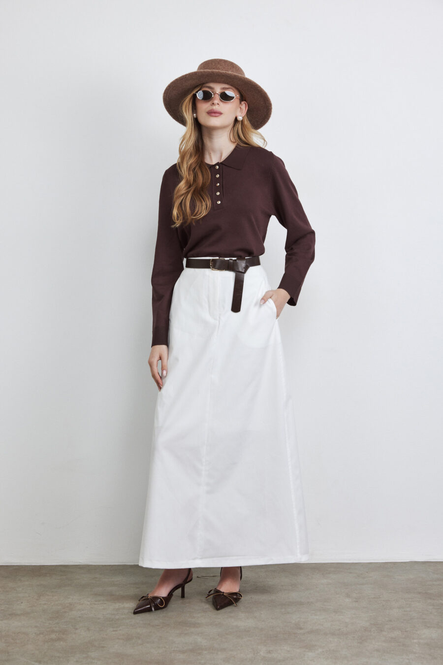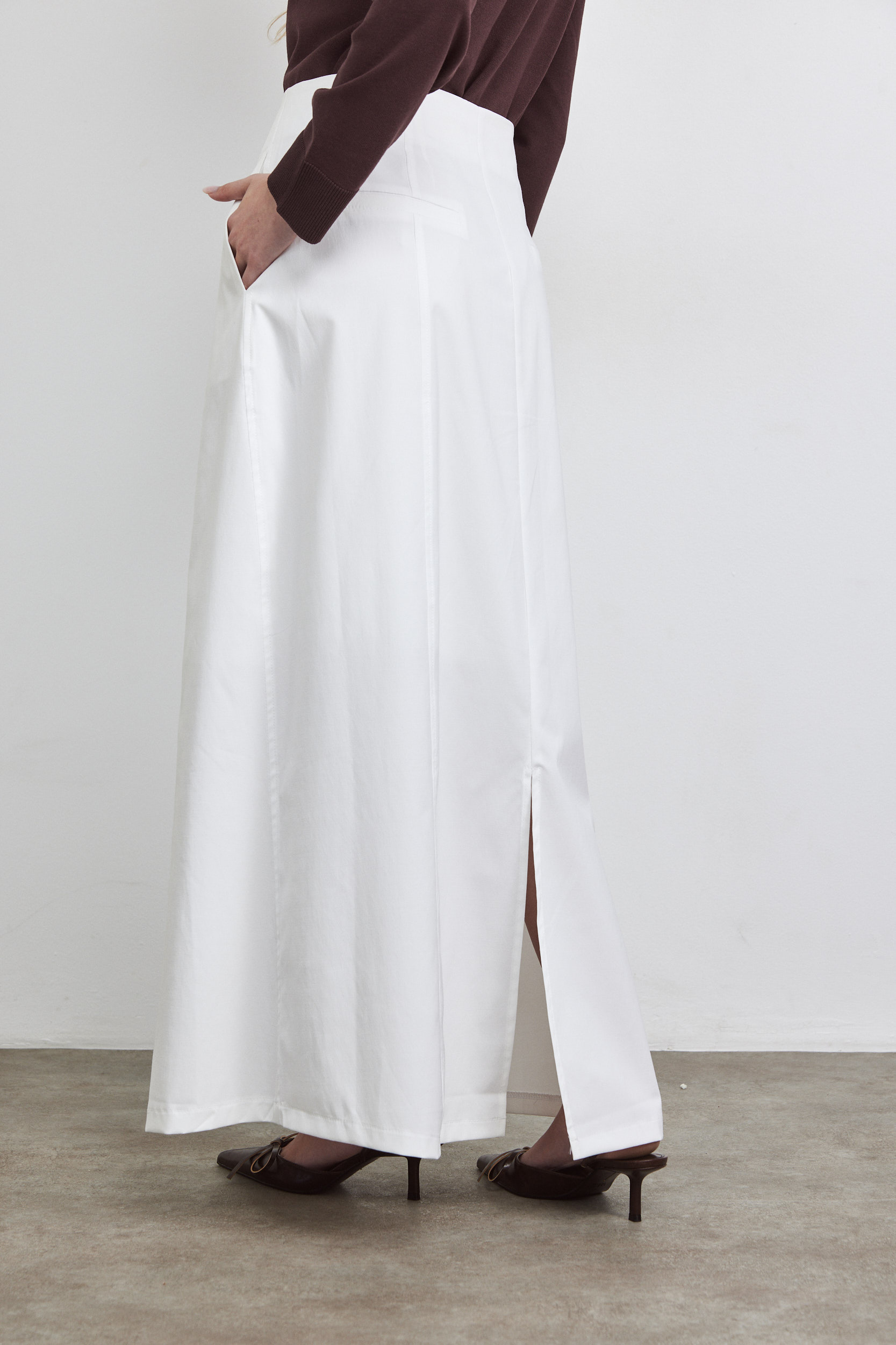 חצאית מקסי גיזרה גבוהה ומחטבת, מדגישה מותן, חתך צד בא מעט קדימה עם כיסים.